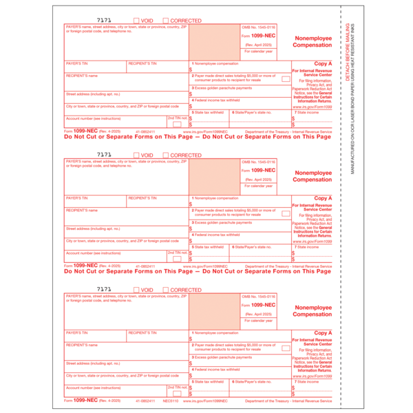 NEC5110 1099-NEC Federal Copy A - 50 Pack SKU: NEC5110 $19.72 Prior Job# Special Instructions Logo & Options : $0 - Color Logo $68 - Black Logo $90 - Color Logo No Charge - 1 Color Logo No Charge - Black Logo Quantity -+ Please select options before adding to cart Add to Cart Add to Cart
